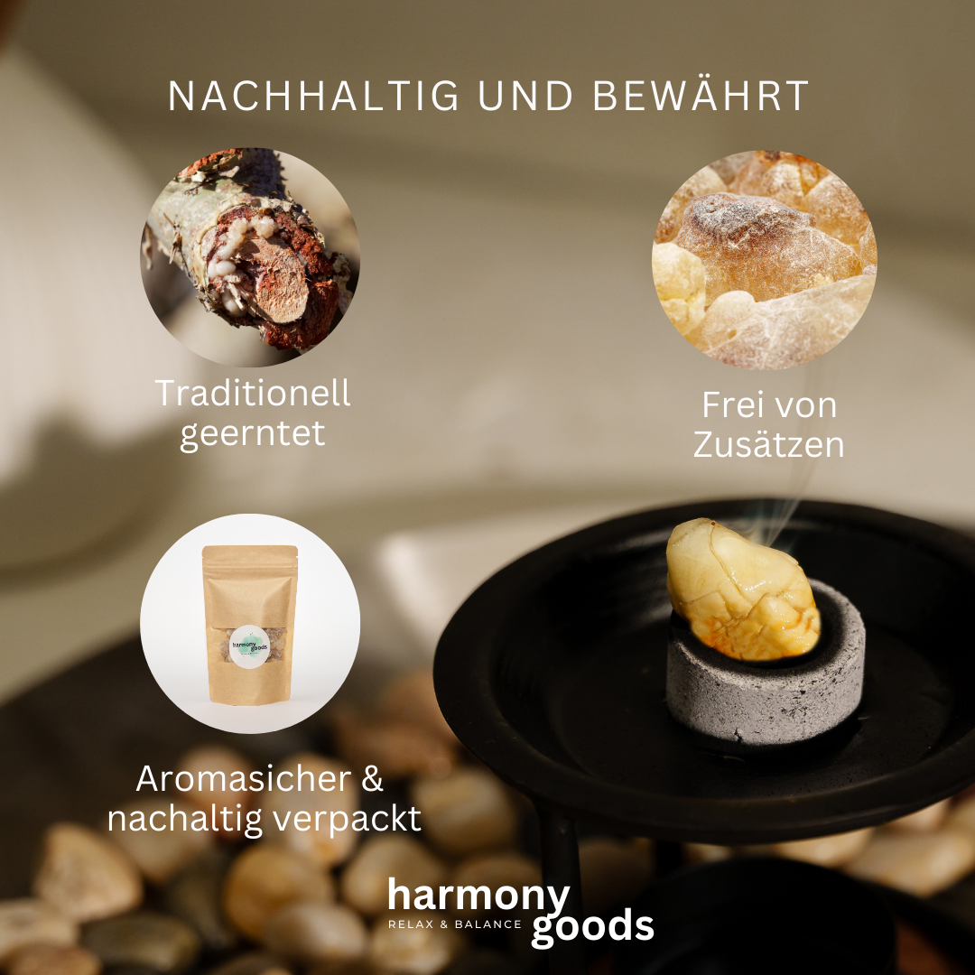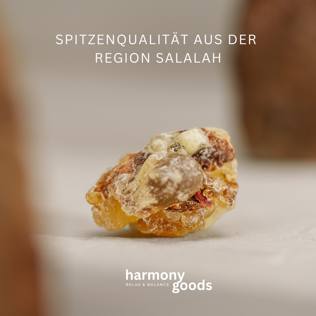 Unser Weihrauch stammt aus der Region Region Salalah, die für ihren besonders reinen Weihrauch bekannt sind. Das Harz wird durch traditionelle Methoden gewonnen: Die Rinde der Boswellia-Bäume wird sorgfältig eingeschnitten, um die wertvollen Tränen zu sammeln. Dieser schonende Prozess bewahrt die hochwertigen ätherischen Öle und Wirkstoffe. Das Ergebnis ist ein Produkt, das Du sehen, fühlen und riechen kannst – ein echtes Stück Natur in seiner besten Form.dem Oman, der weltweit führenden Region für erstklassigen Weihrauch. Mit traditionellen Erntemethoden gewonnen, bleiben die wertvollen Inhaltsstoffe, wie ätherische Öle, optimal erhalten. Jede Charge wird sorgfältig geprüft, um Premium-Qualität zu gewährleisten.